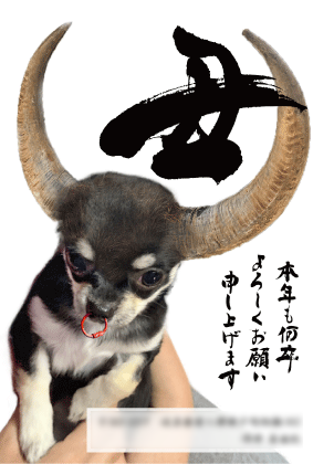 鼻のくつわをつけ、牛の角と頭の繋ぎ目に注意しながら合成し、丑年を演出しました。